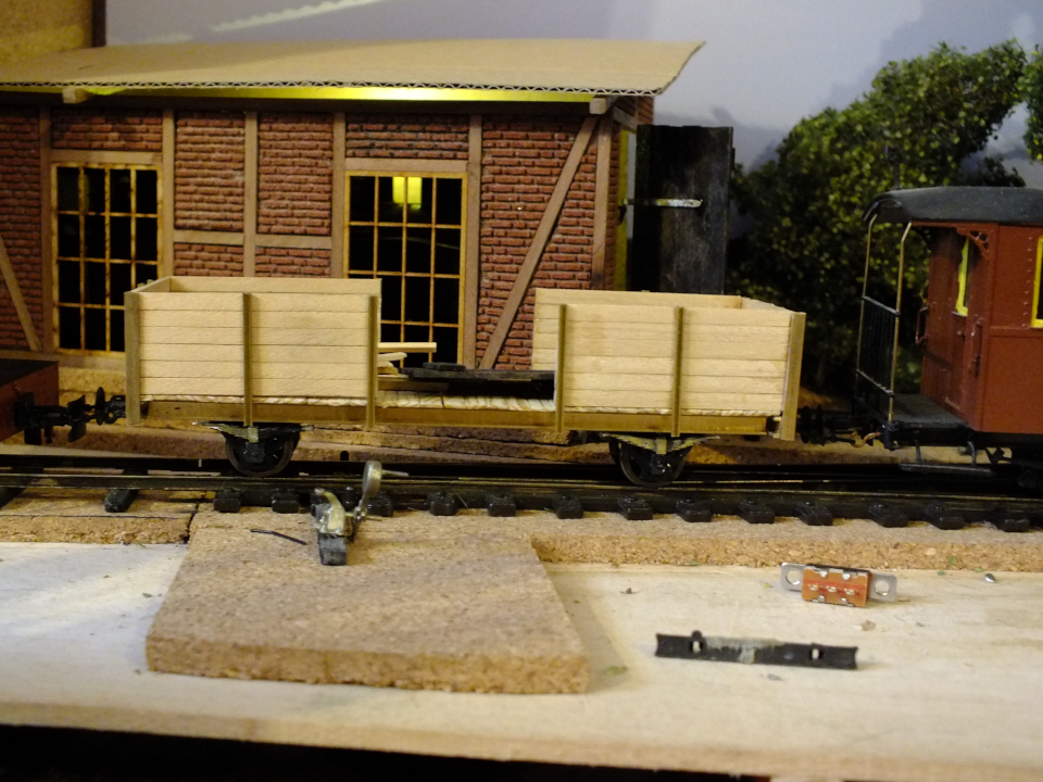 Erfolgreicher verlief das Prototyping meines 0e O-Wagens. Der bekam 1,5 Paar Federn aus der Bastelkiste (in der Hoffnung, dass das 4. Blattfederpaket noch auftaucht) und seinen zweiten Aufbau: