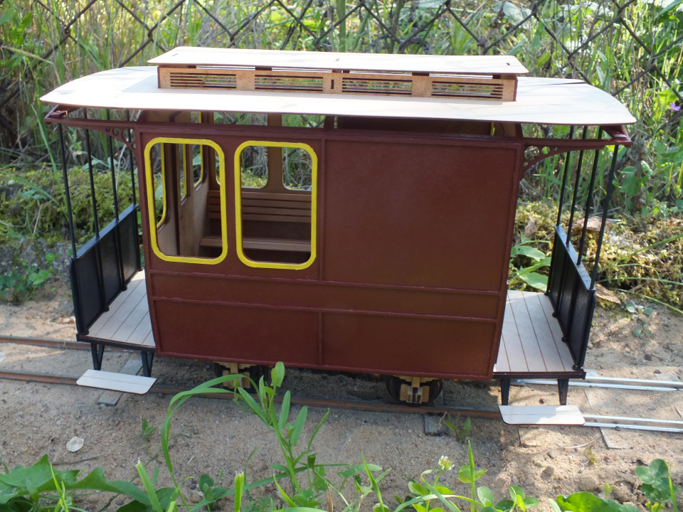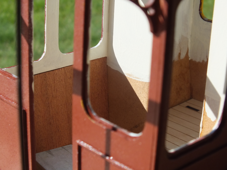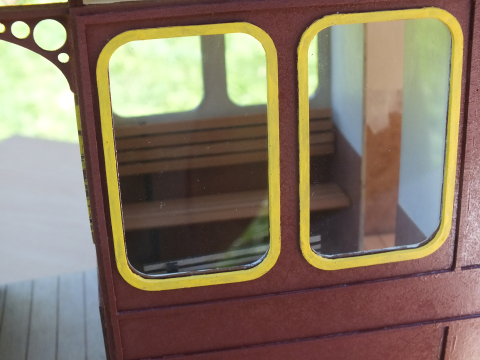 Diese habe ich passend bis unter die Fensterkante zugeschnitten. An den Stirnseiten mit der entspr. Rundung. Den oberen Teil des Wagenkastens habe ich Elfenbeinfarben bepinselt.