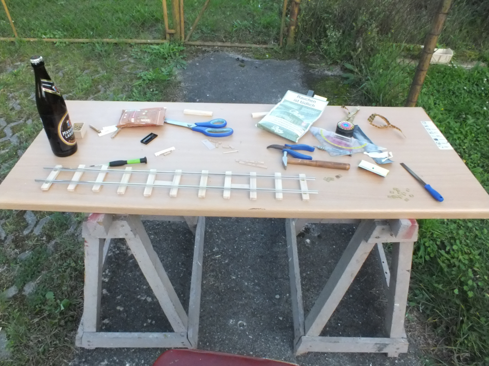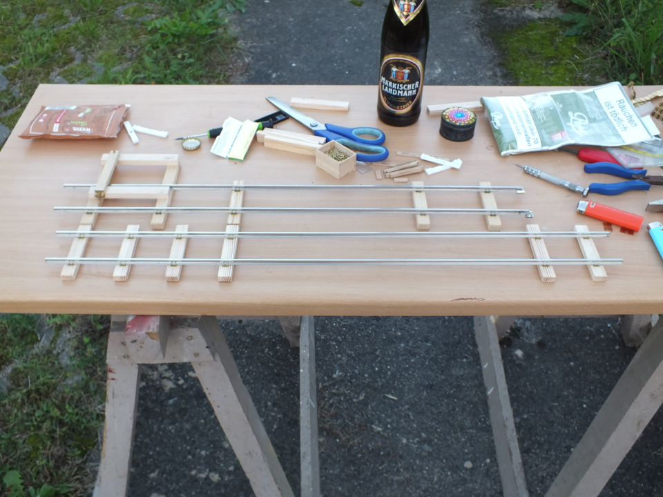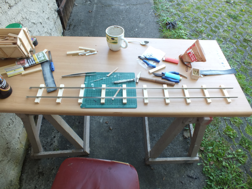 Was in 1:45, 20cm sind, füllt hier meine halbe mobile Werkbank aus. Aber schon mit dem kurzen Stück, konnte ich die Gleisanlagen meiner Gartenbahn verdoppeln :D