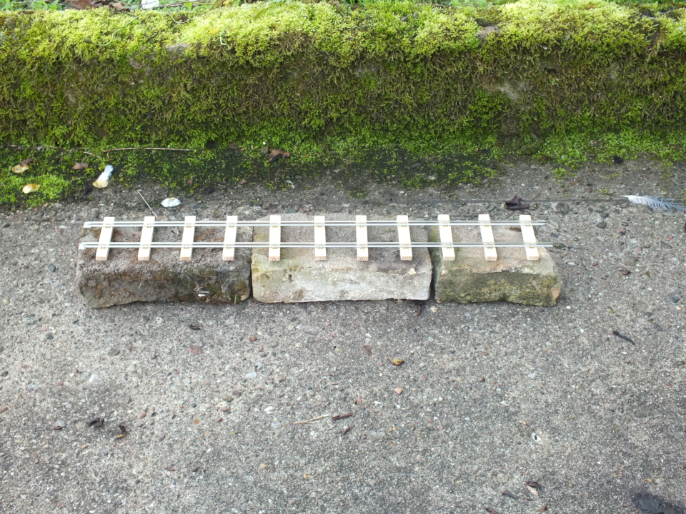 75 und 45mm Schwellenabstand, bei 15x10 bzw. 15x8mm Holzschwellen und um Vergleich das bisher in der Werkstatt verbaute 60cm Gleis: