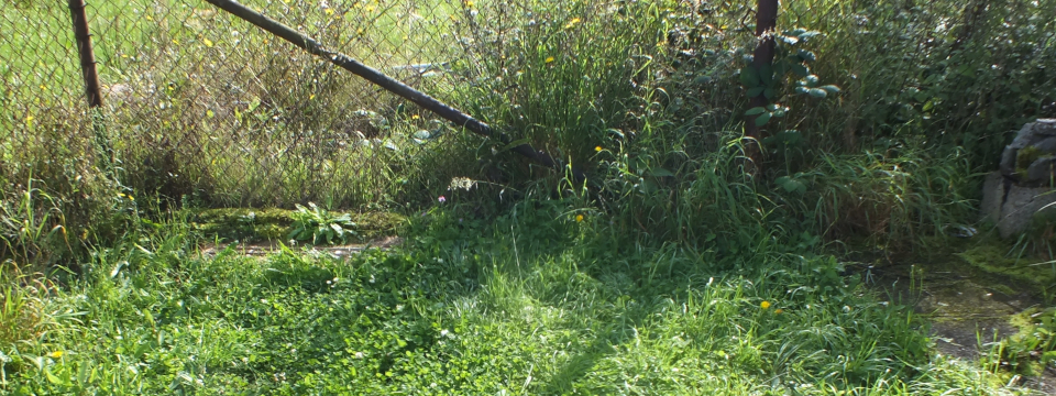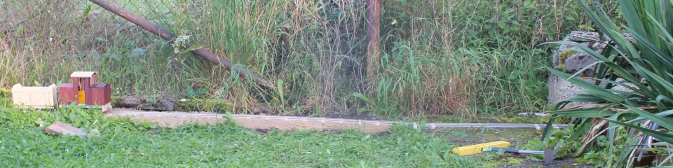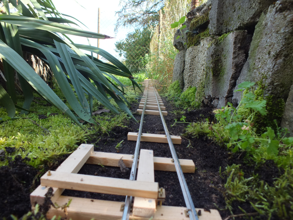 Ich hatte für mein Stück Gleis eine der hintersten Ecken des Grundstücks aber doch recht nah an meiner Werkstatt gewählt. Irgendwann viel mir auf, dass ich nur ca. 1,5m zu überbrücken hatte um festen, betonnierten Boden zu erreichen um hier meine Gleise ohne viel Aufwand einfach auszulegen und so auf etwas mehr Strecke zu kommen. Dazu ein Überblicksbild links, schön eingewachsen meine bisherigen ca. 70cm Testgleich.
