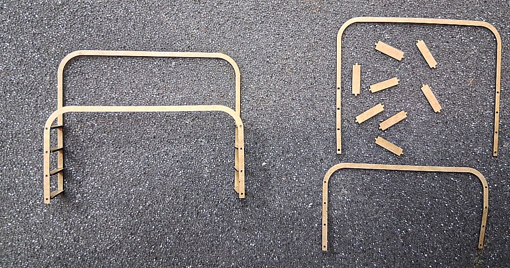 Heute ist dies nicht mehr erforderlich (Zeichnen, Film erstellen, ätzen), sondern durch die Lasertechnik in Verbindung mit CAD natürlich viel einfacher. Georg hatte nicht nur die Verstärkungsdreiecke gezeichnet, sondern auch die Holme (in zwei verschiedenen Höhen) und dazu passend die Trittstufen konstruiert. Diese greifen mit kleinen Zapfen in den Holm und werden dort verklebt. Gelasert wurden die Teile aus 0,5 mm Kraftplex.