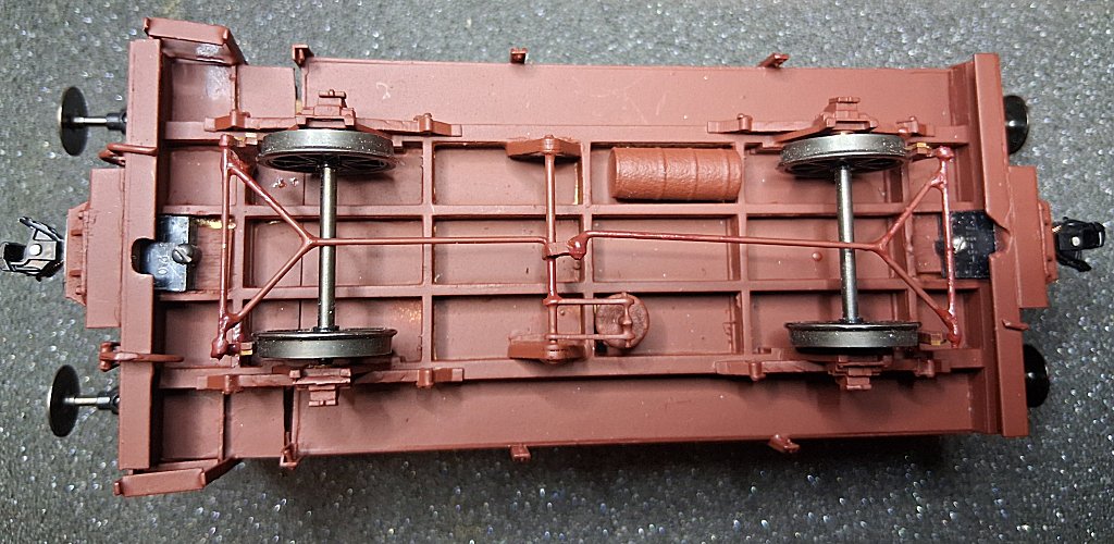 Da meine Fahrgestelle eine Sonderanfertigung von Jaffa sind und diese auf dem Rahmen der Kelsterbacher Wagen basieren, passen der Bremszylinder und Luftbehälter von Jaffa nicht, da die Abstände zwischen den Längsträgern zu gering sind. Dies hatte ich schon vor einiger Zeit festgestellt, und Georg hatte dann als eines seiner ersten Konstruktionswerke sowohl den Bremszylinder als auch den Luftbehälter etwas kleiner konstruiert. Nach Erhalt der Datei hatte ich mir mal testweise einige Bremszylinder und Luftbehälter im MJF - Verfahren drucken lassen, die ich jetzt verwenden konnte. Die Bremswellenhalter hatte Georg gezeichnet und aus Kraftplex ausgelasert, die Betätigungshebel über dem Bremszylinder hatte ich noch 2 Sätze von Jaffa liegen. Der Bremszylinder unterscheidet sich vom Jaffa-Bausatz nur dadurch, dass er etwas kleiner ist und nicht aus einzelnen Teilen zusammengesetzt werden muss. Die Betätigungsstange mit dem Querträger für die Betätigungshebel werden genau wie im Jaffa-Bausatz aus einem 1 mm Messingdraht mit einem 0,5 mm Querstück gefertigt. Hierzu presse ich das Ende des 1 mm Drahtes im Schraubstock flach und bohre dann das 0,5 mm Loch durch. Damit war der Wagen dann fertig zum lackieren.