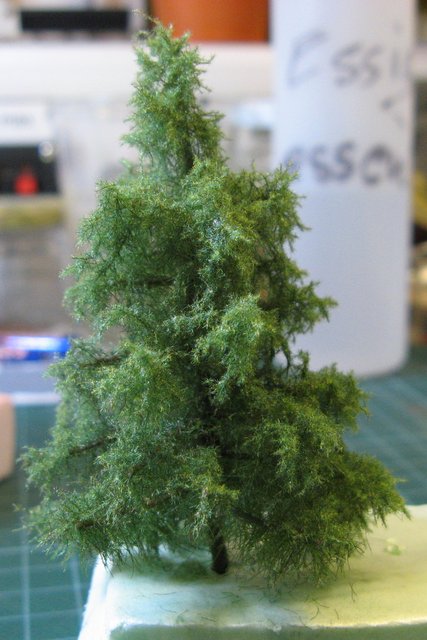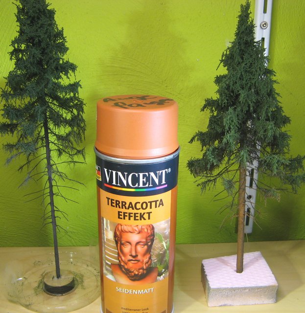 Da mir die gekauften Nadelbäume so nicht ganz gefielen, habe ich diese mit Terracotta-Spray nachgebessert. Links ohne und rechts mit dem Spray, dabei habe ich auch die unteren Äste ruhig ein wenig mit eingesprüht.