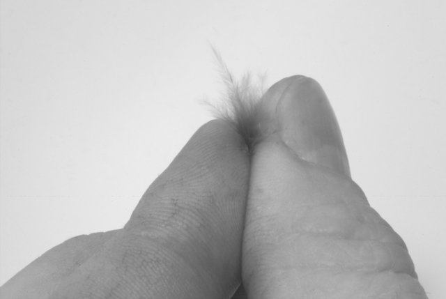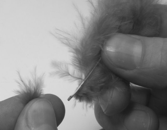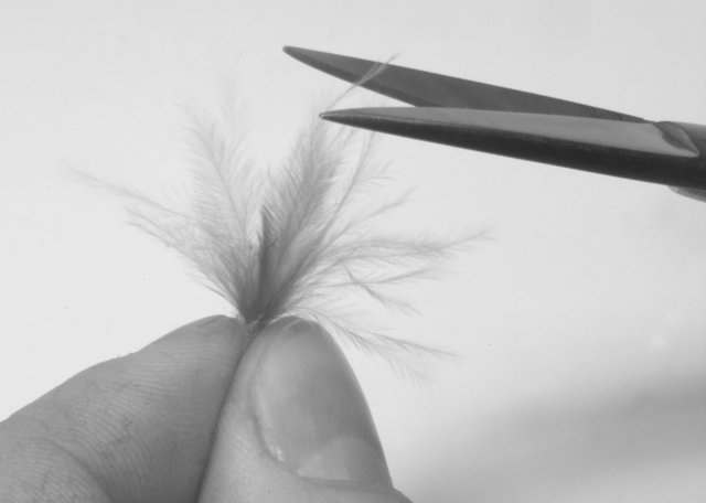 Haltet die Feder in der einen Hand und zieht einige Teile vom Kiel mit der andere Hand ab.
