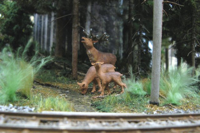 Hallo zusammen, ich hatte ja schon erwähnt, das es noch wild wird. Endlich habe ich mich entschieden welches Rotwild ich nehmen möchte. Zur Auswahl standen Tiere von Noch und von Woodland Scenics. Ich habe mich für die Noch-Tiere entschieden. Hier seht ihr eine erste Stellprobe. Was mir gerade auffällt, die Tiefenwirkung auf dem oberen Foto ist schon einmal sehr gut von dem Wald!!!