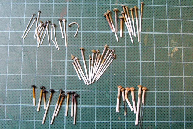 Als Ausgangsmaterial verwende ich Kunststoffrundstäbe (das Material ist egal haupsache es schmilzt). Ich benutze Stäbe mit einen Durchmesser von 0,5, 0,8, 1,0 und 1,5mm. Der Stab wird an einen Ende angezündet und keine Sekunde später wieder ausgeblassen und sofort in eins der Bohrungen gedrückt. Nach nicht einmal 5 Sekunden kann man den fertigen Pilz heraus ziehen.
