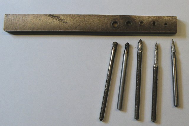 Um die Pilze zu prägen verwende ich ein dickes Stück Pertinax, man kann aber auch ein dickes Stück Teflon oder Buchesperrholz verwenden. In dieses bohrte ich verschiedene Vertiefungen mit verschiedenen Fräser ein.