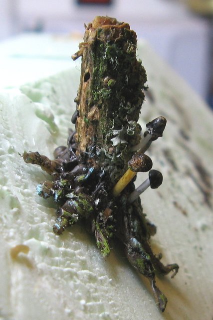 Nun setzte ich ein paar Pilze in Bohrungen mit Sekundenkleber an den Baumstumpf ein.