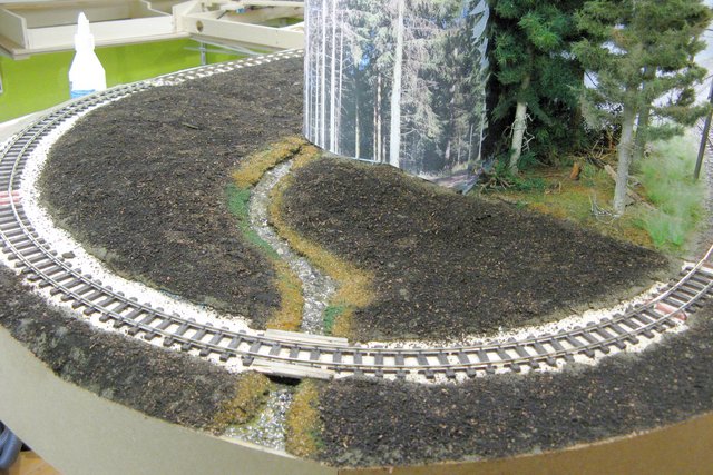 Auf den feuchten Spachtel streute ich ausgesiebten Waldboden. Dieser wurde mit entspannten Wasser und verdünnten Leim eingesprüht.