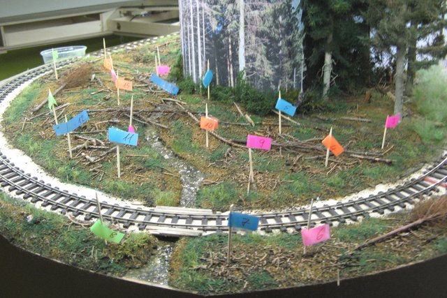 Sooo, weiter geht´s: Die Bäume wurden wieder entfernt und durch einen Zahnstocher-Wald (hoffentlich sind noch genug Zahnstocher für die Käsehäppchen da) mit Nummerierung ersetzt. Jetzt konnte der Waldboden weiter gestaltet werden.