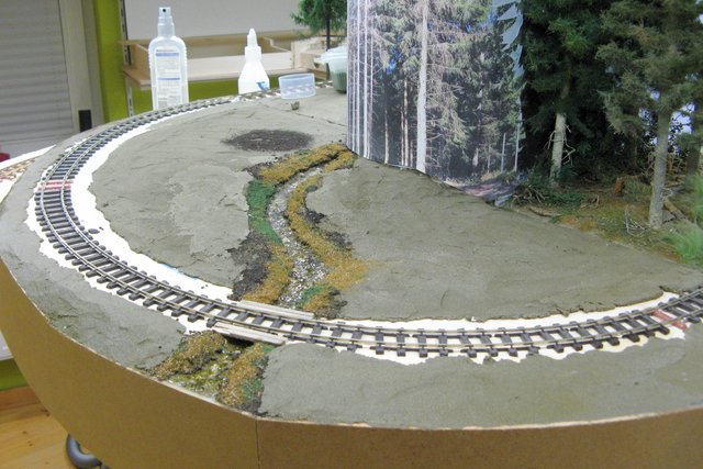 Als Untergrund verwende ich einen Sand-Farbe-Leim-Spachtel, dieser hat den Vorteil das man direkt in ihn Grünzeug pflanzen kann oder später durch aufsprühen von entspannten Wasser wieder geschmeidig ist und weiter arbeiten kann.