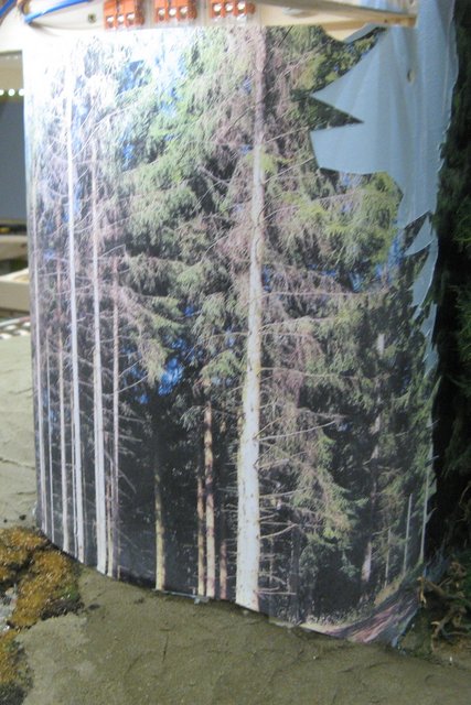 Hier möchte ich Euch zeigen wie ich einen Nadelwald baue. Da ich meine Anlage komplett in Lichtkästen baue, habe ich original Bilder von Nadelwälder am PC zusammen gestellt und auf mattem Fotopapier in DIN A3 ausgedruckt. Die Ausdrucke wurden mit einen Klebestift eingeschmiert und auf den himmelblauen Hintergrund aufgeklebt. Damit die Ausdrucke einigermaßen „wasserfest“ sind sprühte ich diese mit Vallejo Matte-Firnis ein.