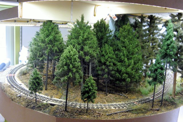 Momentan bin ich dabei viele kleinere Bäumchen, Stäucher und Büsche zu fertigen, die ich zwischen und vor die Fichten pflanzen werde. Dort, wo die Grasfasern sehr hoch sind (vier Schichten) bringe ich mit dem flexibelen "Vampiglue" loses Laub auf, um kleinstes Gestrüpp und die Krautschicht nachzubilden.
