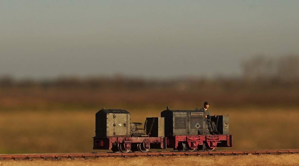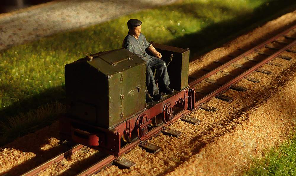 Hier ist zu erkennen, wie der Strom von den Schleifern zum Motor geleitet wird. Die Lok schnurrt recht ordentlich und gleichmäßig über die Feldbahngleise. Die Stromabnahme funktioniert gut.