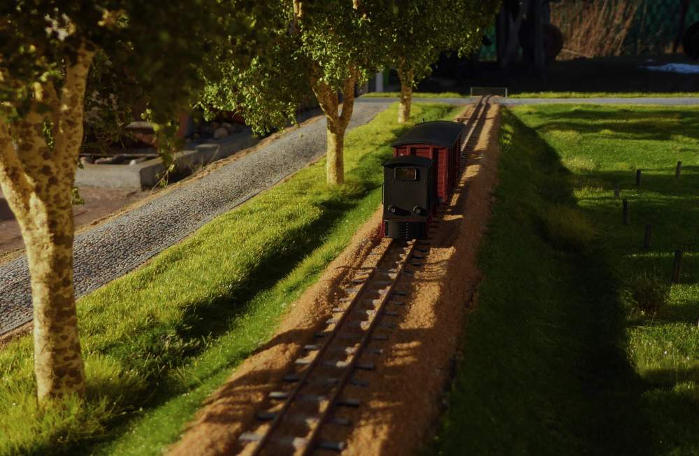 Die Kombination aus Pflasterstraße, Allee und Bahndamm wollte ich schon sehr lange ins Modell umsetzen. Die Breite der Pflasterstraße und die Abstände zwischen Straße, Baumreihe und Bahndamm entsprechen genau der Vorbildsituation.