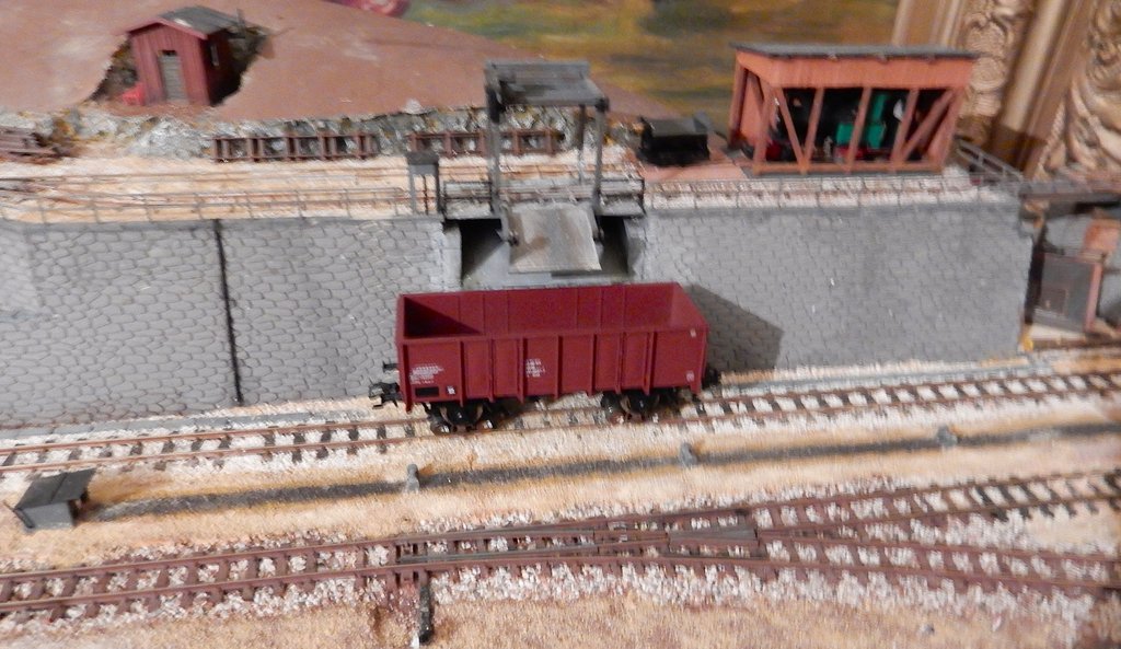 Die Schotterverladung wurde vervollständigt und das Ladegleis hat eine Spillanlage erhalten, damit die zu beladenen Wagen unter der Schütte verschoben werden können. Sie ist nicht funktionsfähig. Das Seil fehlt noch.