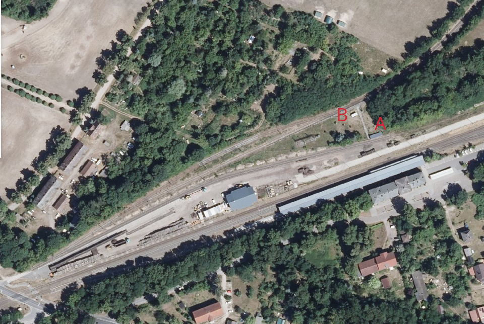 Zuerst die ungefähre Position des Mastes im oben zu sehenden Gleisplan des ehem. Schmalspurbahnhofs: