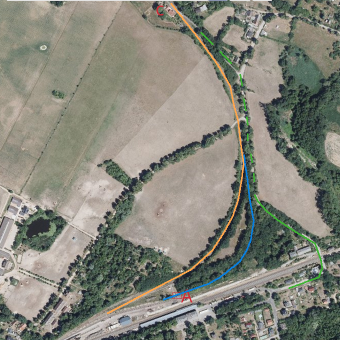A ist wieder die Unterführung, C ist die im Eingangsbeitrag erwähnte alte Mühle. Orange der Streckenverlauf der normalspurigen BKB, blau der Vermutete Schmalspurige verlauf, beide ohne Umfahrgleise. Das war mir am Sonntag morgen aber so noch nicht vollumfänglich bewusst. Ich wollte einfach nur mal die Betriebsruhe auf der BKB nutzen und mir das einzig Streckenstück was nicht vom Weg aus einsehbar ist anschauen. An der Stelle an der sich die 3 Linien treffen liegt das in einem Einschnitt (die gesamte Kurve vom Bahnhof Richtung Buckow) und ist durch eine bewaldete Böschung weder einsehbar noch leicht zu erreichen.